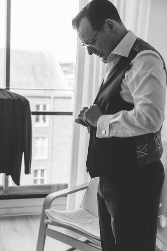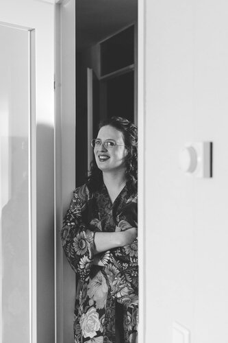 We begonnen de dag ontspannen in de flat waar Richard en Maaike wonen. Maaike deed haar voorbereidingen in hun eigen appartement, Richard maakte het zich gemakkelijk bij de buurman. Ik huppelde vrolijk tussen de twee appartementen heen en weer. De voorbereidingen waren rustig, Richard en Maaike kozen ervoor om hier nog geen mensen om hen heen te hebben. Alleen de kapster, ceremoniemeester en ik waren aanwezig om de transformatie naar stralend bruidspaar te aanschouwen.