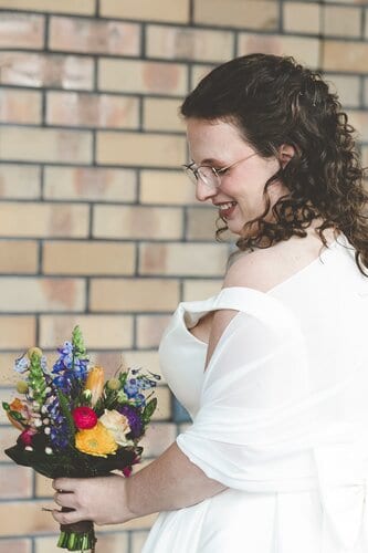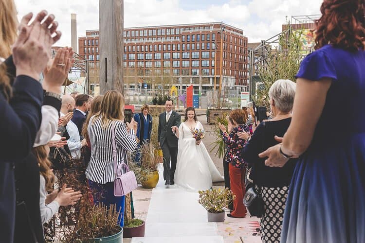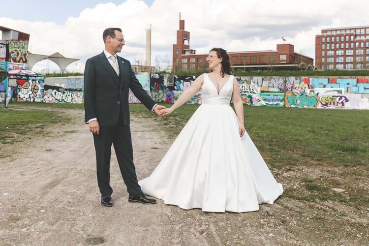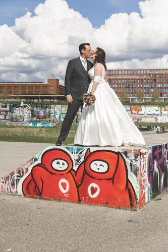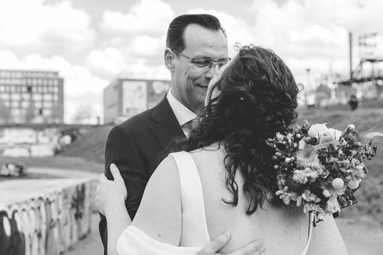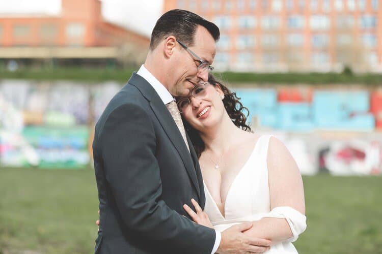 Tijdens de borrel heb ik het bruidspaar meegenomen voor de fotoshoot. De foto’s hebben we gemaakt direct rondom de trouwlocatie en zijn daardoor heerlijk stads met graffiti en golfplatengebouwtjes. Ik hou enorm van foto’s in de natuur, maar als stadsmens ging mijn hart hier ook echt harder van kloppen. Uiteraard mochten de uilen tijdens de shoot ook niet ontbreken.