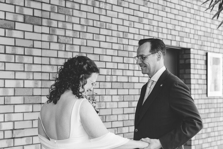 De first look lieten we beneden in de hal plaatsvinden, ook weer zonder publiek. Echt een momentje voor hun samen, de eerste keer als bruid en bruidegom. En wát voor bruid en bruidegom, ze zagen er zo mooi uit! Dat eerste moment van elkaar zien, is ook echt wel één van mijn favoriete momentjes van een trouwdag. Na al die maanden voorbereiding is het ineens écht! Love it.