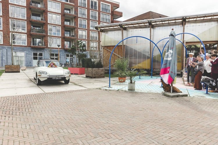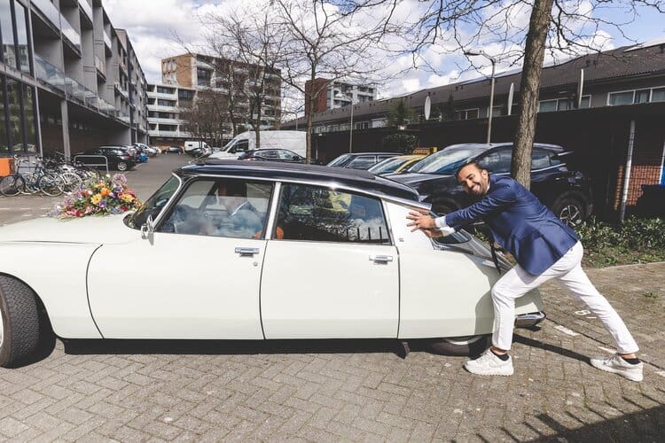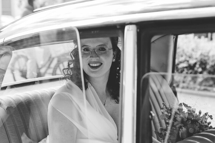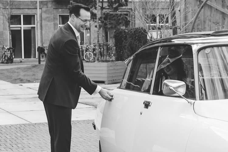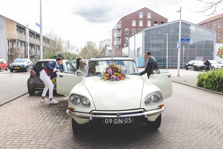 Na een heerlijk verzorgde lunch door de ceremoniemeester vertrokken we richting trouwlocatie. Dit bleek echter iets makkelijker gezegd dan gedaan, want de trouwauto wilde niet starten! Oei! Op het moment dat we ons maar allemaal in mijn Cliootje wilden gaan proppen kwam het gelukkig allemaal toch nog goed. Ik scheurde voor het bruidspaar uit, gooide mijn auto en tas ergens neer en was net op tijd klaar om de aankomst van het bruidspaar te fotograferen. Gelukkig was dit het enige stressvolle moment van de dag, verder liep alles gewoon op ontspannen en liefdevolle rolletjes.