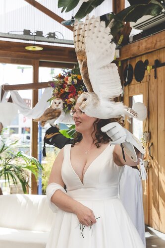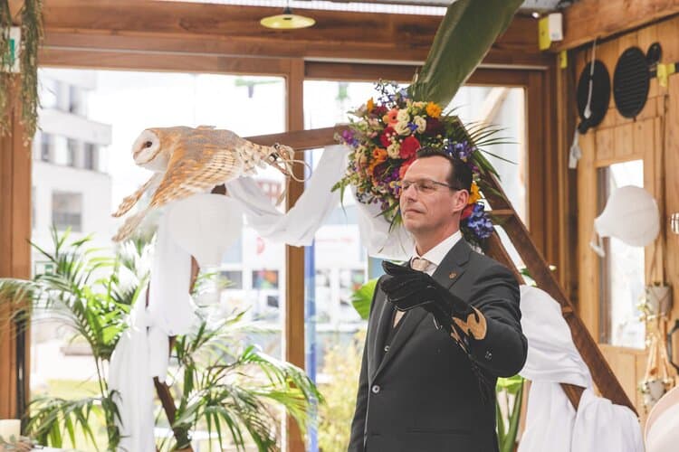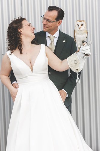 De ceremonie zat vol prachtige woorden van buuurman Tarik en van Maaike en Richard zelf die hele mooie geloftes naar elkaar uitspraken. Heel misschien moest ik stiekem zelf ook even een klein traantje wegpinken. De ringen werden spectaculair aangevlogen door een setje witte uilen, heel tof! De uilen (van Uiltopia) waren ook nog te gast op de borrel (mét ijskar!) die volgde op de ceremonie.
